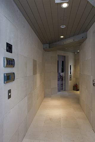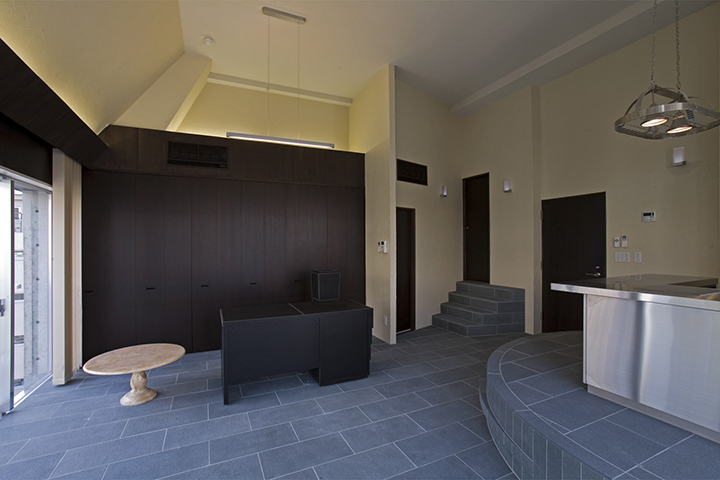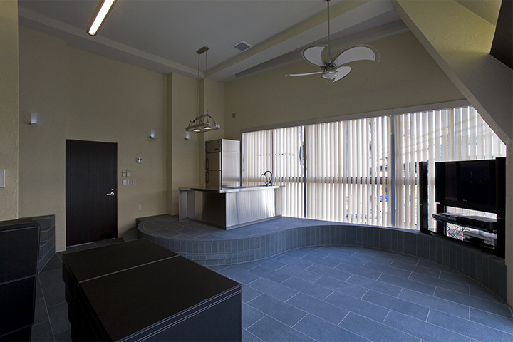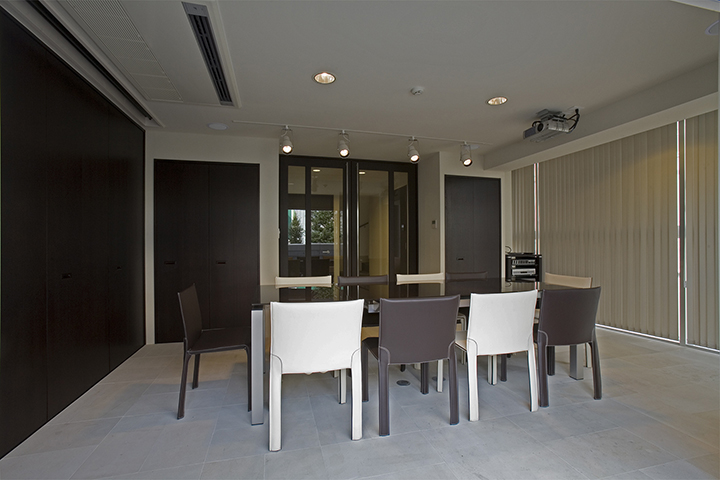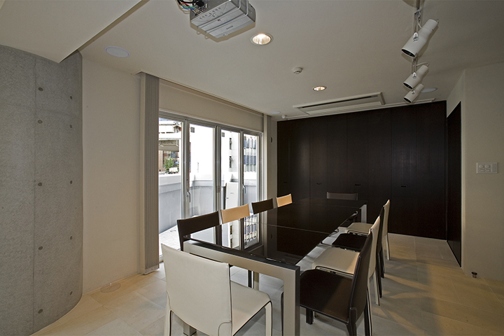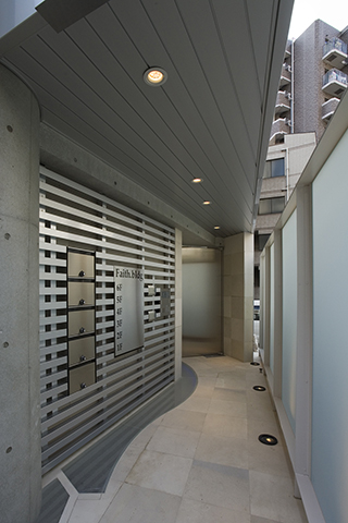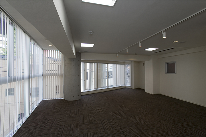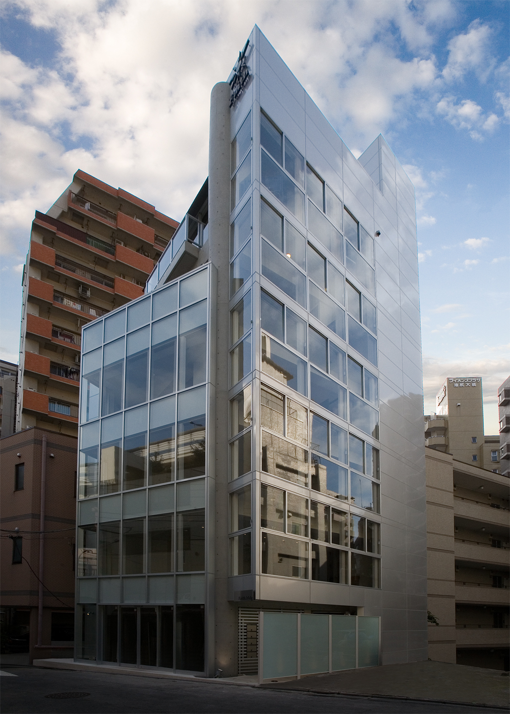 FaihtBldgは大橋ジャンクションにほど近い、地上6階建てのオフィスビルです。変形した敷地であるが敷地なりの四角形と、道路に平行のグリッドを組み合わせた平面計画としたため、空間と外観に豊かな変化を与えることができました。外観は、自社ビルであるため、高さと大きさを感じさせ、かつガラス、アルミ、コンクリート打ち放しをバランスよく組み合わせ、軽快でシャープなものとしました。開放された北側と西側には大きなガラス面を設け、透明感のある建物とし、また内部からの眺めも開放的であり実際の面積以上の広さを感じることができます