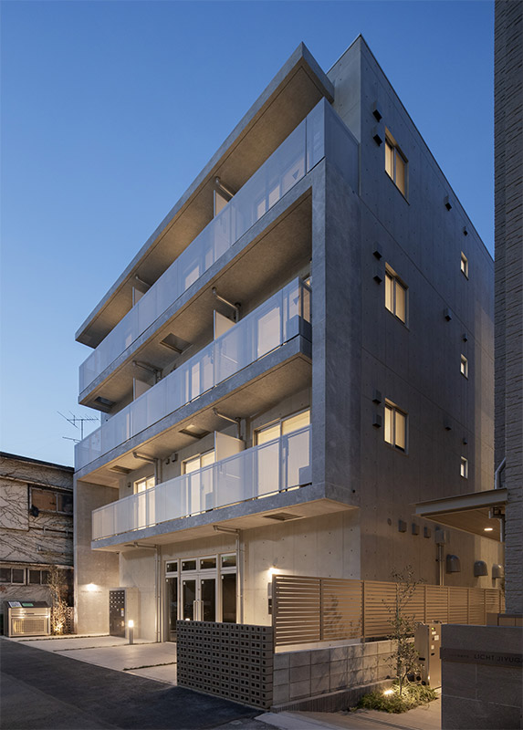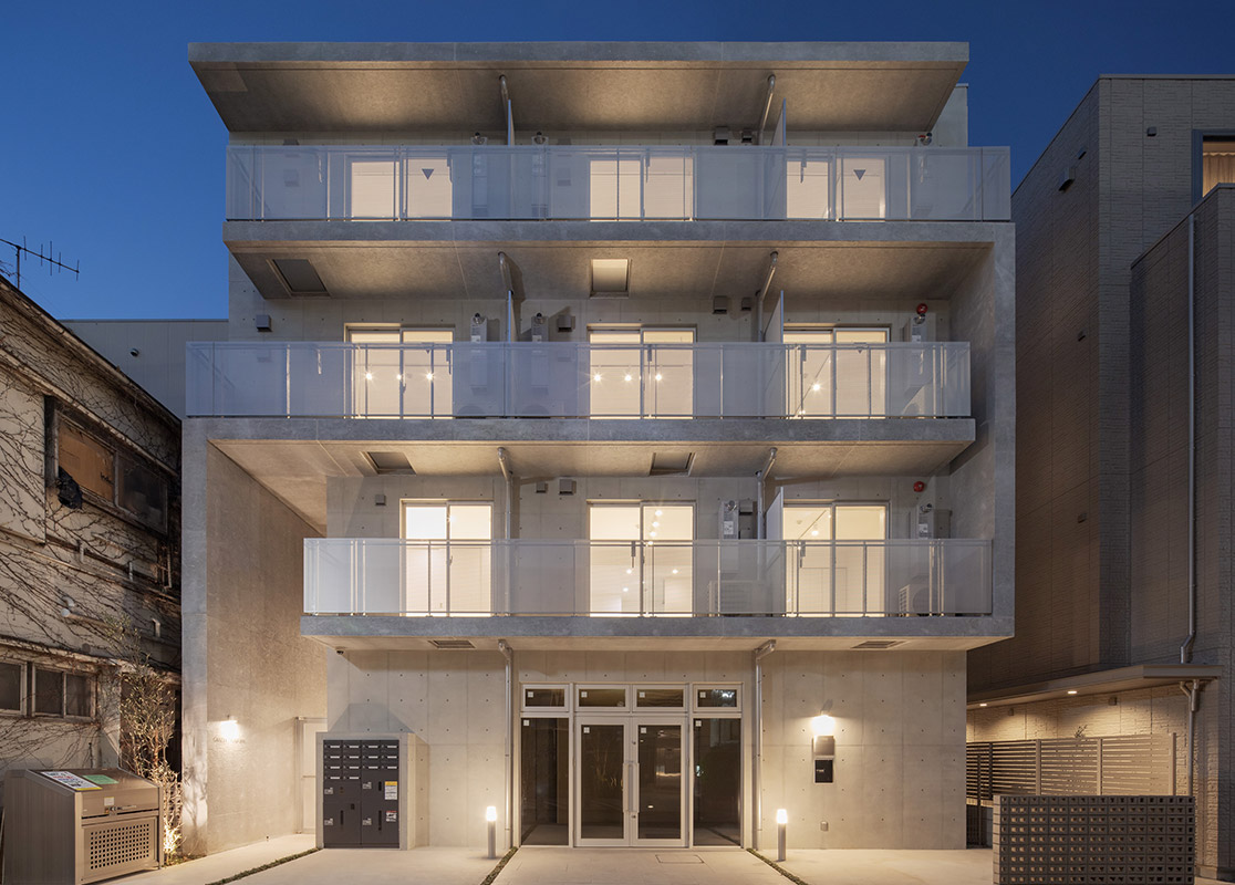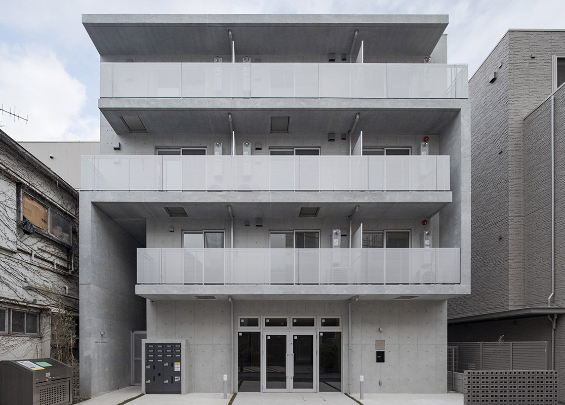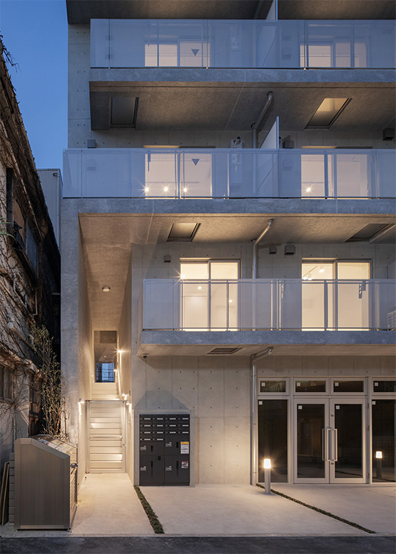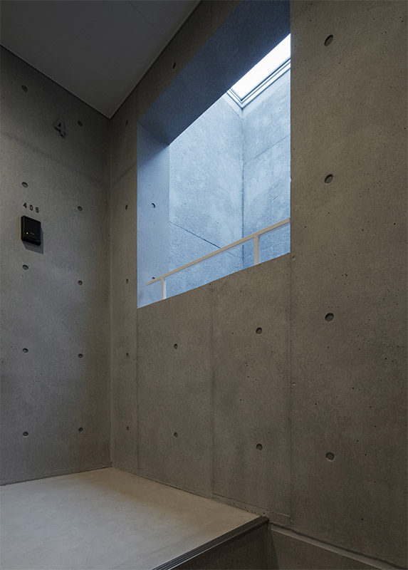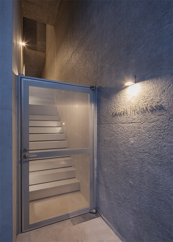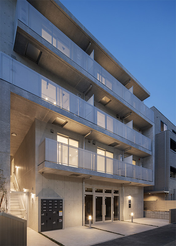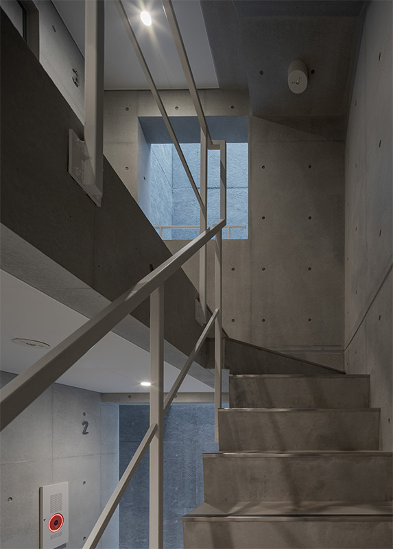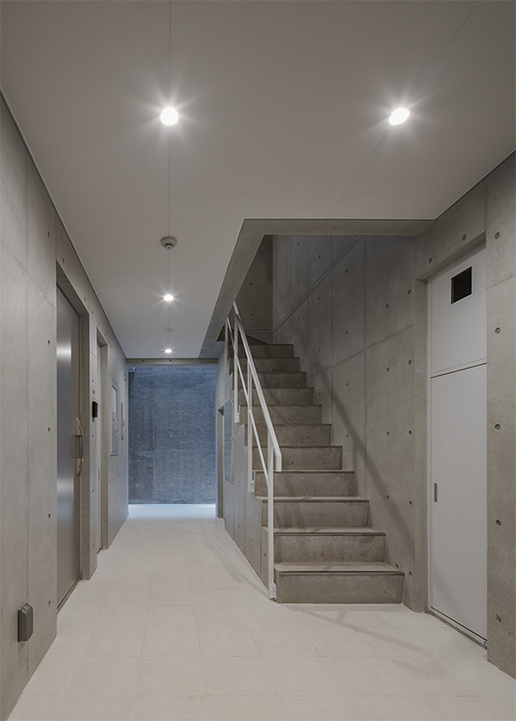 共同住宅へのエントランスを兼ねる1 階から2階へと昇る階段に5.6mの高天井、15mある奥行きを感じられる階段、階段を上った先の吹き抜けなど、空間の多様性をもたせたグレイシア自由が丘。バルコニーのスチール手摺が軽やかな軟らかさを印象付け、コンクリート打放しのボリュームと袖壁が重厚感を強調し、重さと軽さのバランスを重要視した物件。