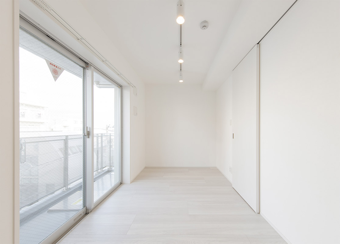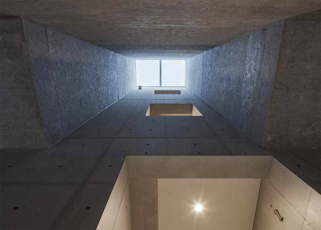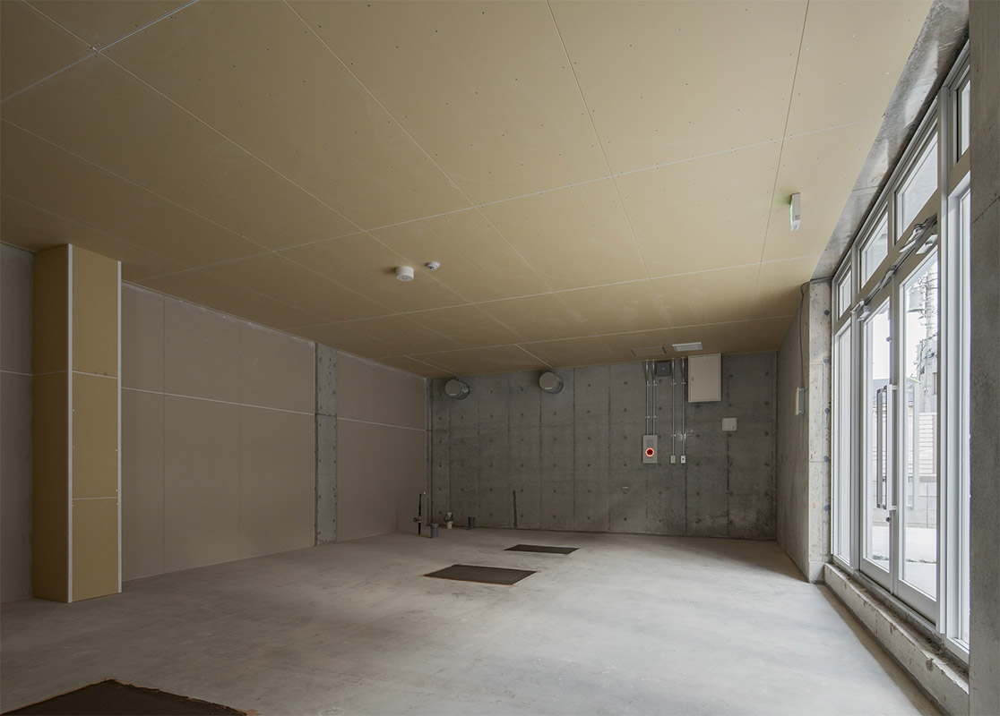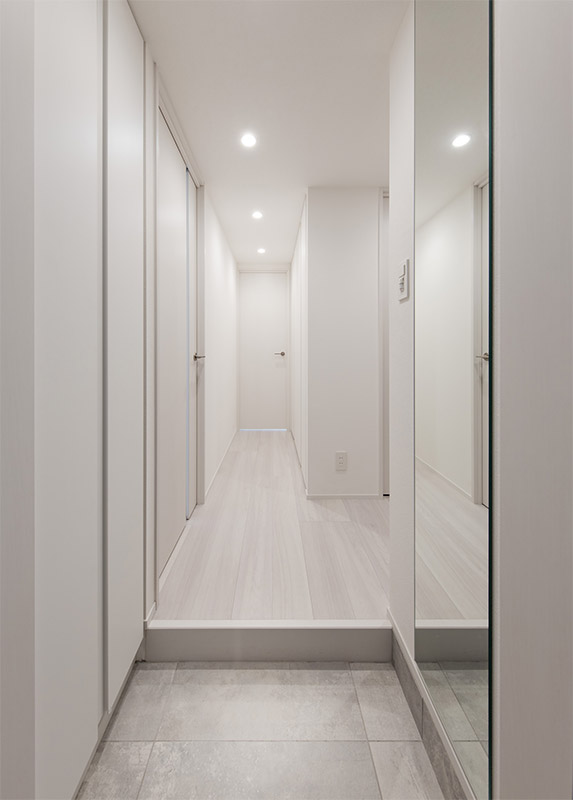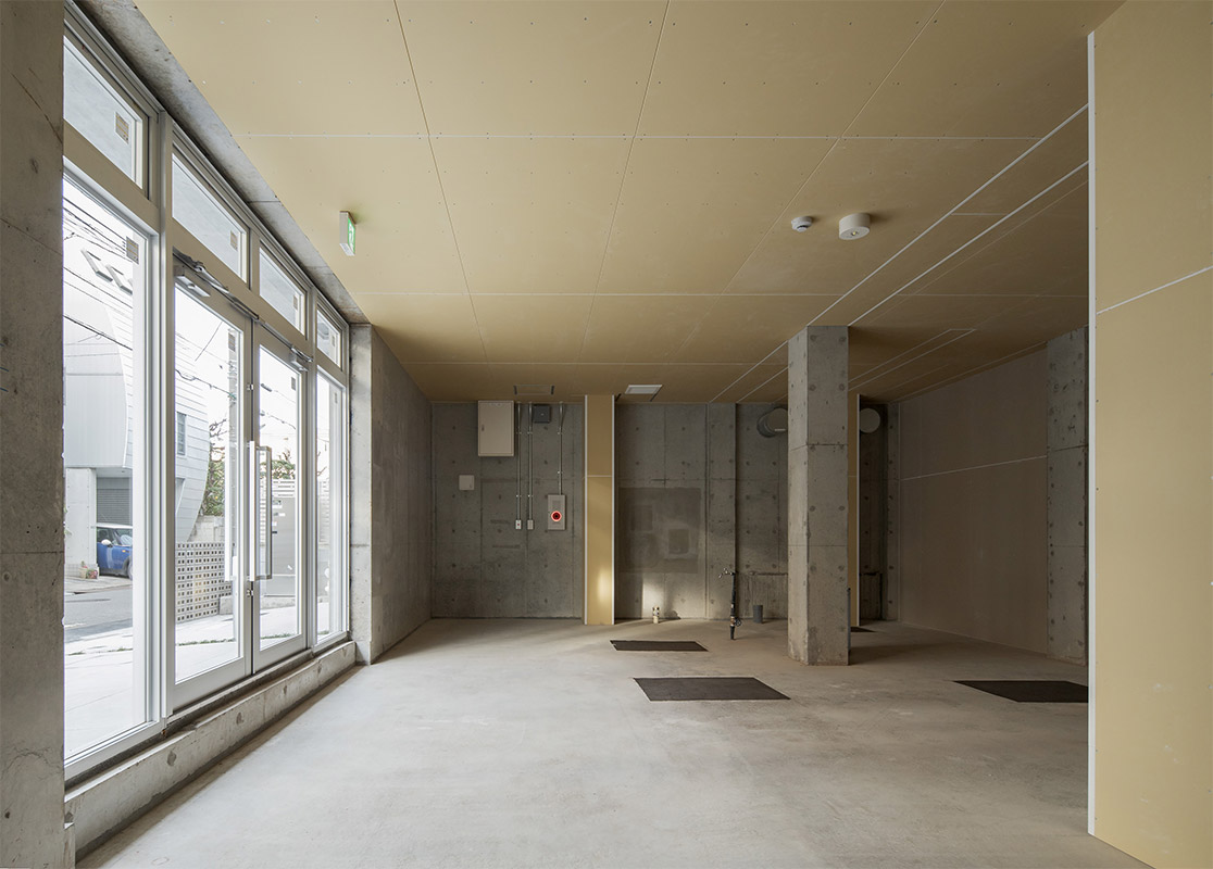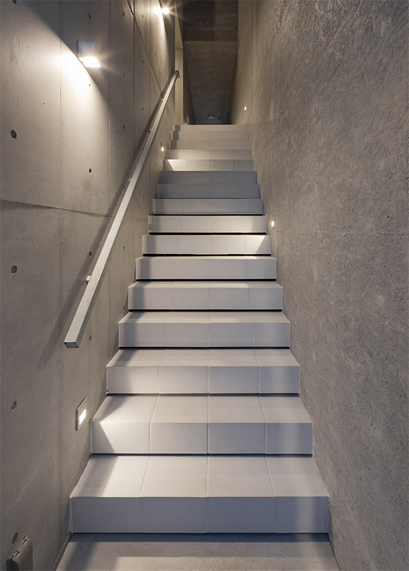 共同住宅へのエントランスを兼ねる1 階から2階へと昇る階段に5.6mの高天井、15mある奥行きを感じられる階段、階段を上った先の吹き抜けなど、空間の多様性をもたせたグレイシア自由が丘。バルコニーのスチール手摺が軽やかな軟らかさを印象付け、コンクリート打放しのボリュームと袖壁が重厚感を強調し、重さと軽さのバランスを重要視した物件。