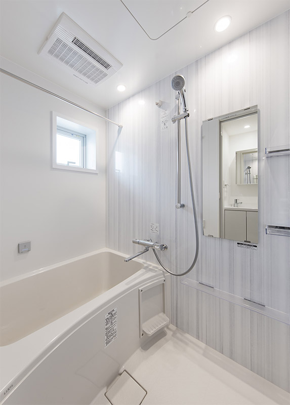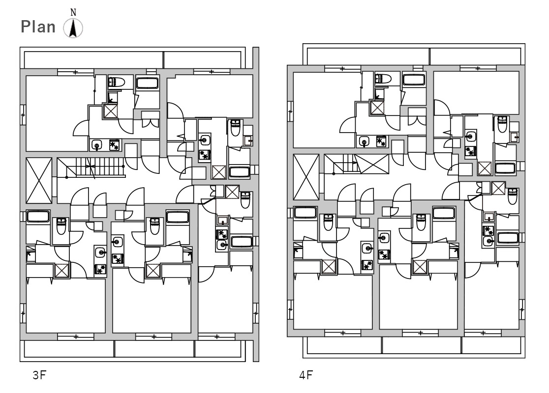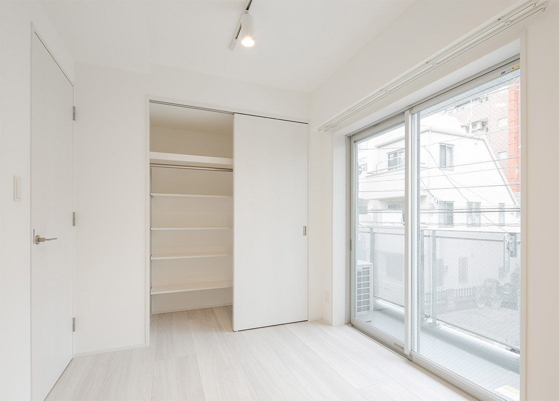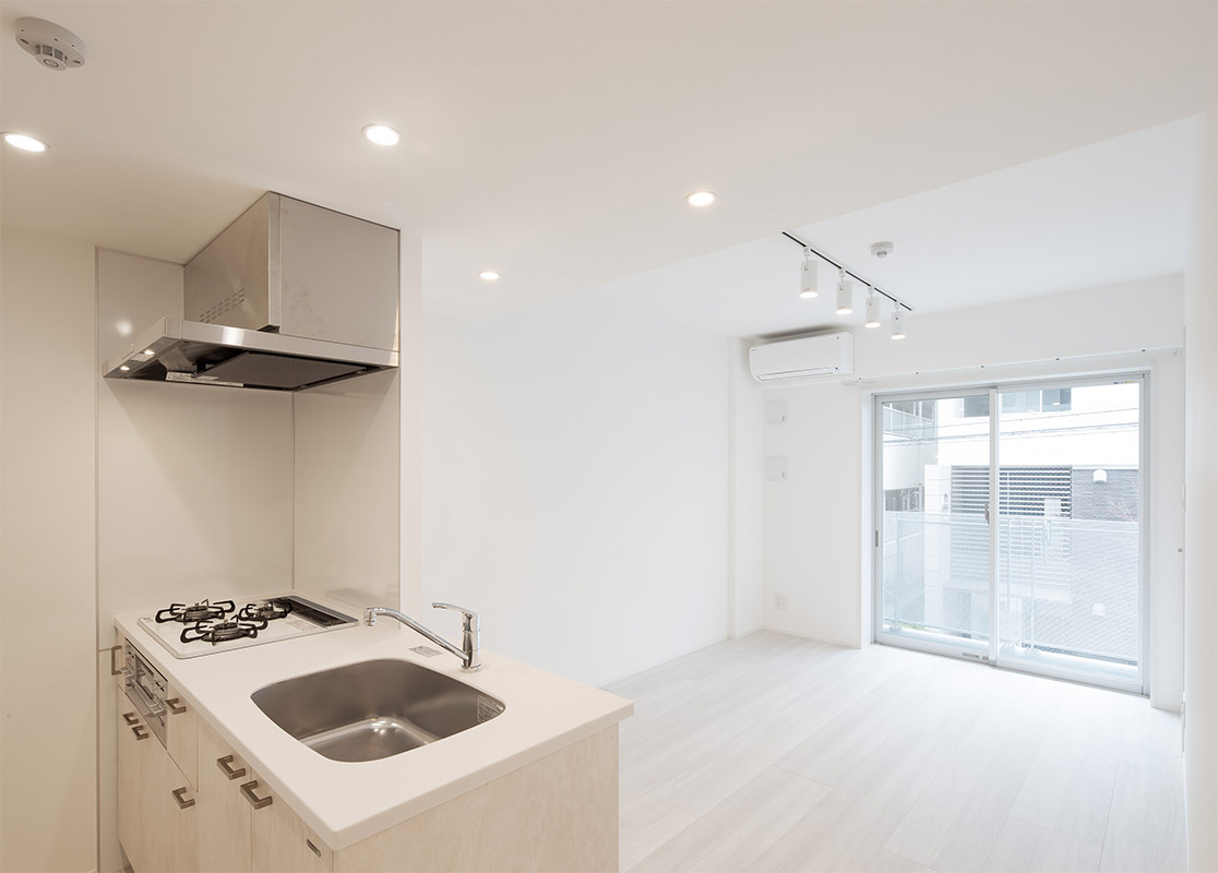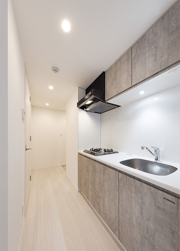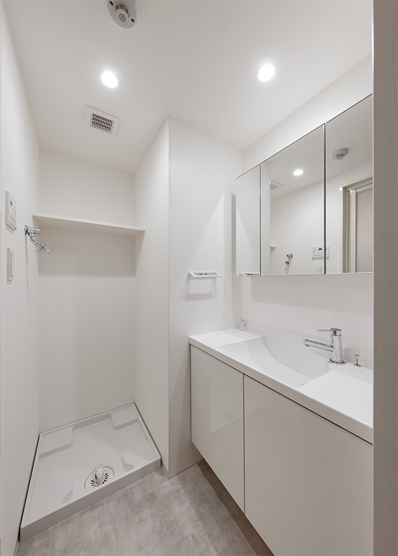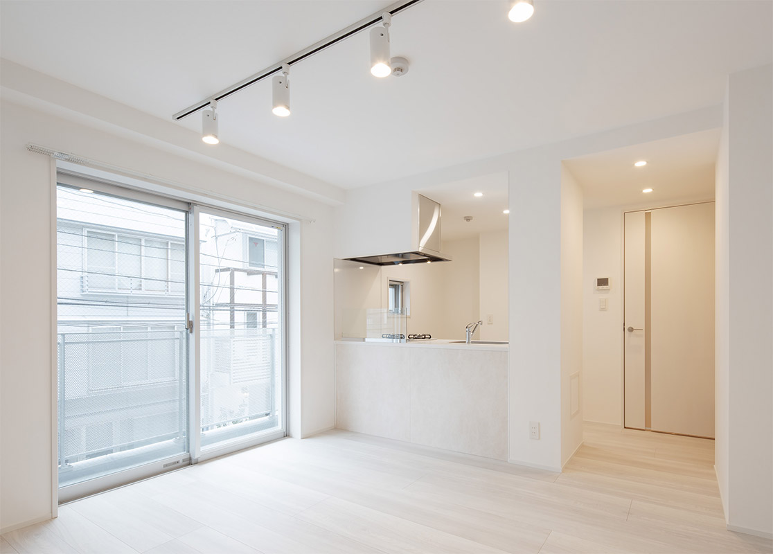共同住宅へのエントランスを兼ねる1 階から2階へと昇る階段に5.6mの高天井、15mある奥行きを感じられる階段、階段を上った先の吹き抜けなど、空間の多様性をもたせたグレイシア自由が丘。バルコニーのスチール手摺が軽やかな軟らかさを印象付け、コンクリート打放しのボリュームと袖壁が重厚感を強調し、重さと軽さのバランスを重要視した物件。