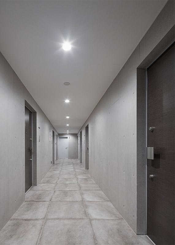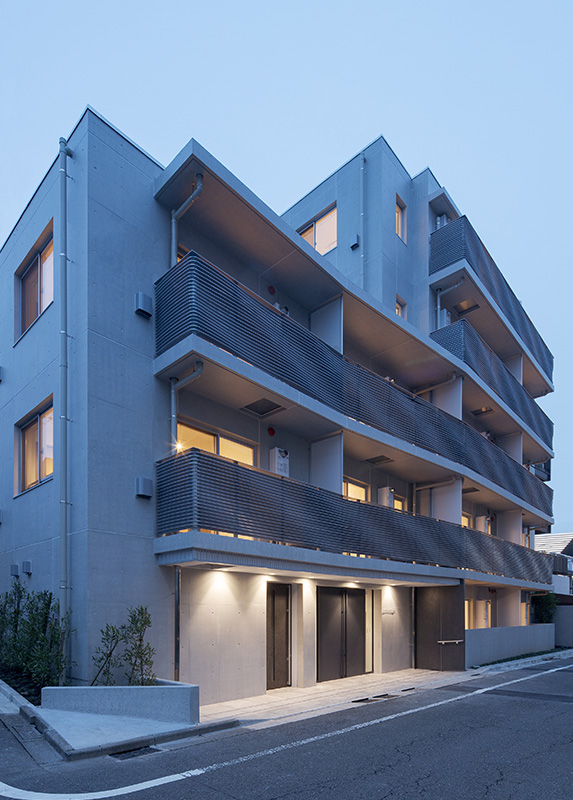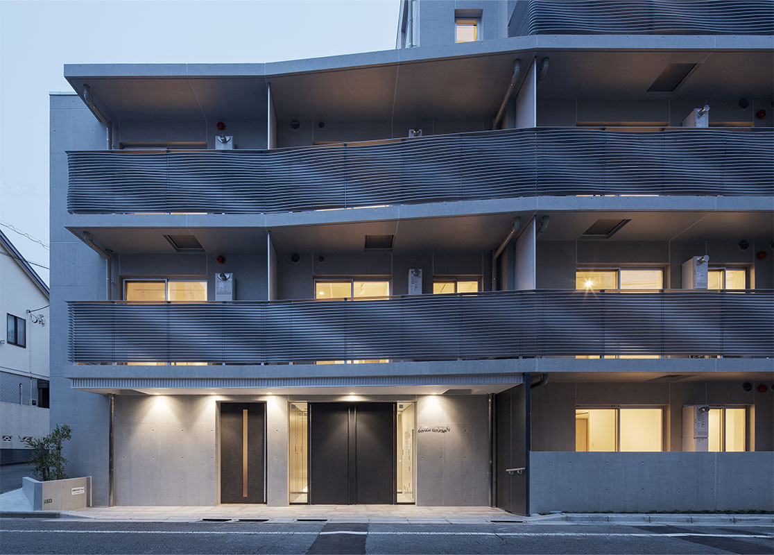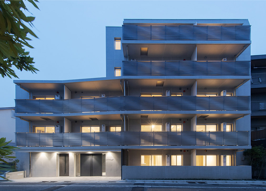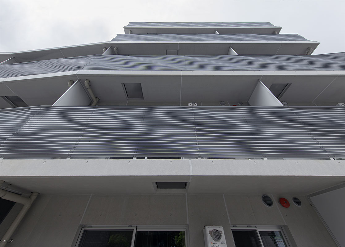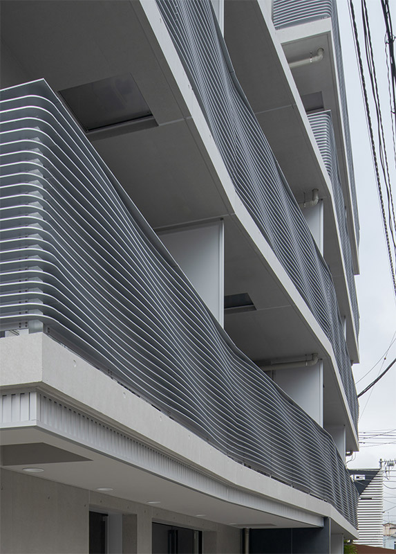 グランデュオ上野毛4は、コンクリートの建物に、金属板を積層させゆるやかに弧を描くように構成した手摺を取り付けることで、流れるような動きのある表情を創り出しています。その堅牢な佇まいは、見る角度や光の陰影によって変化するように設計しています。