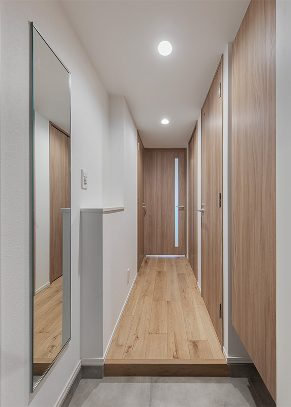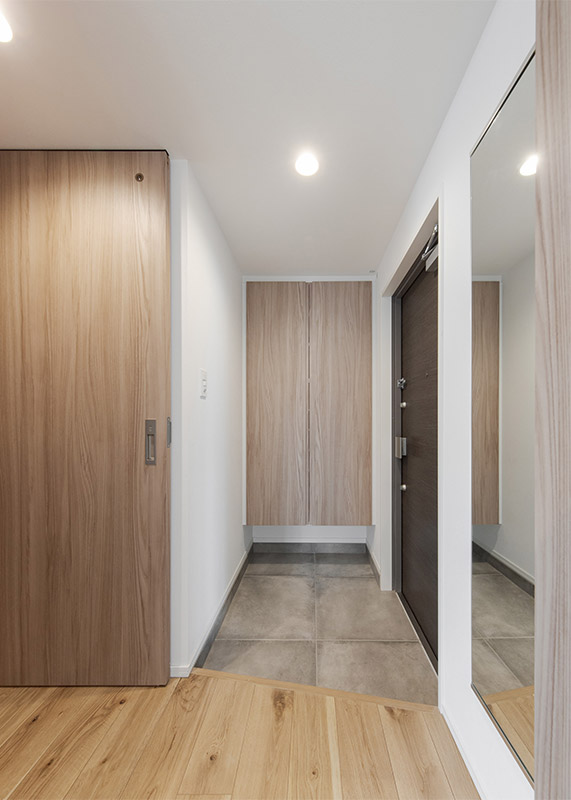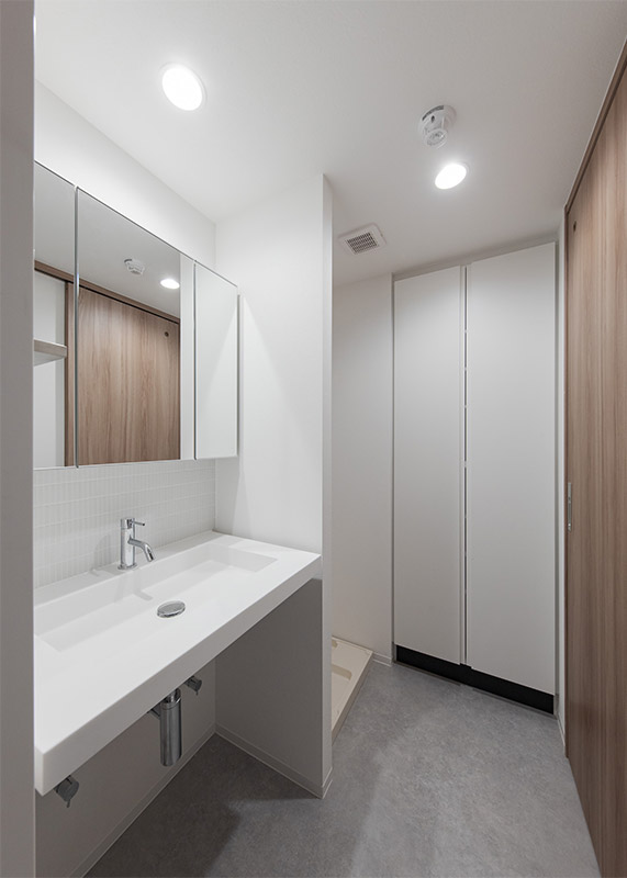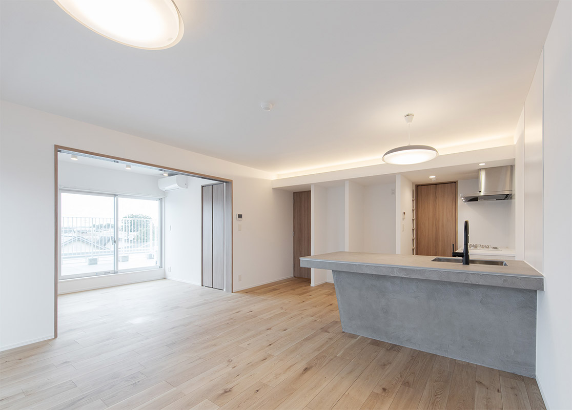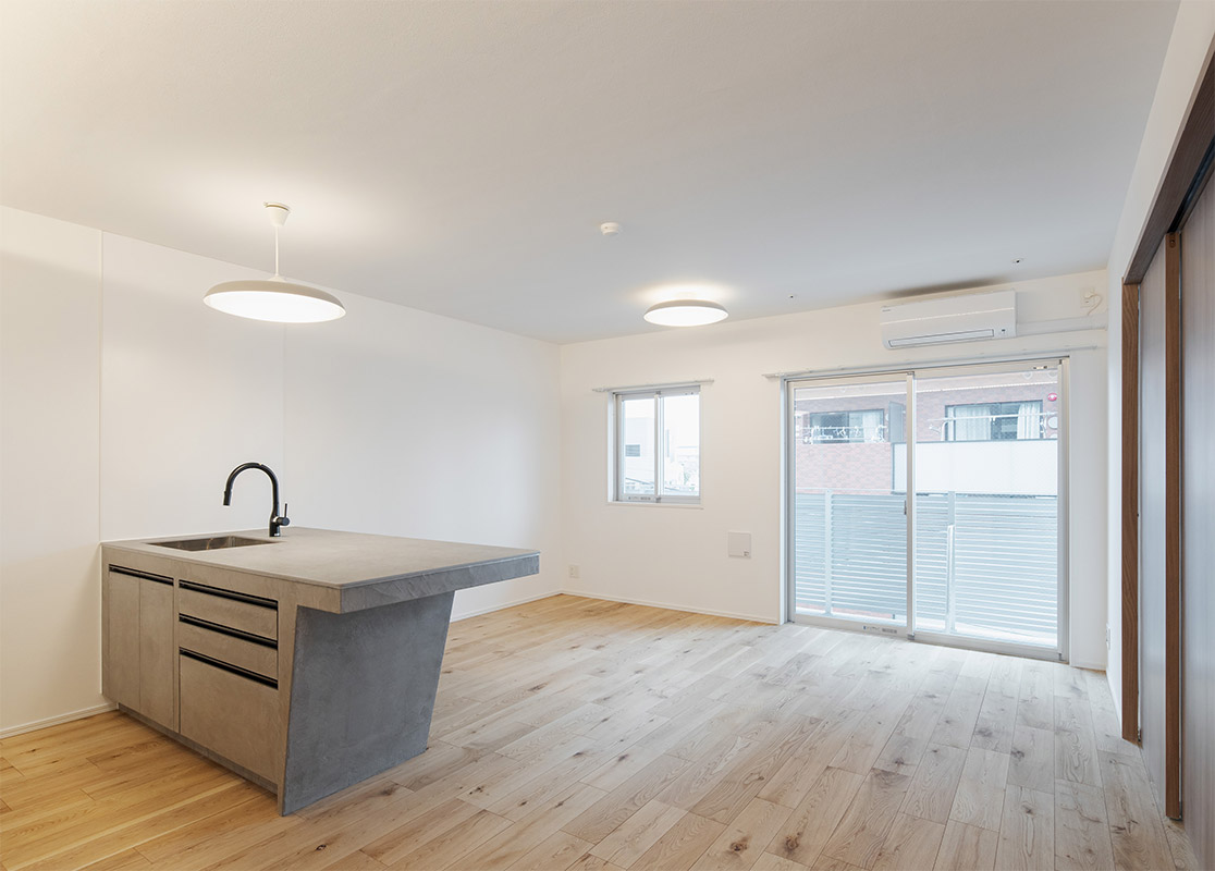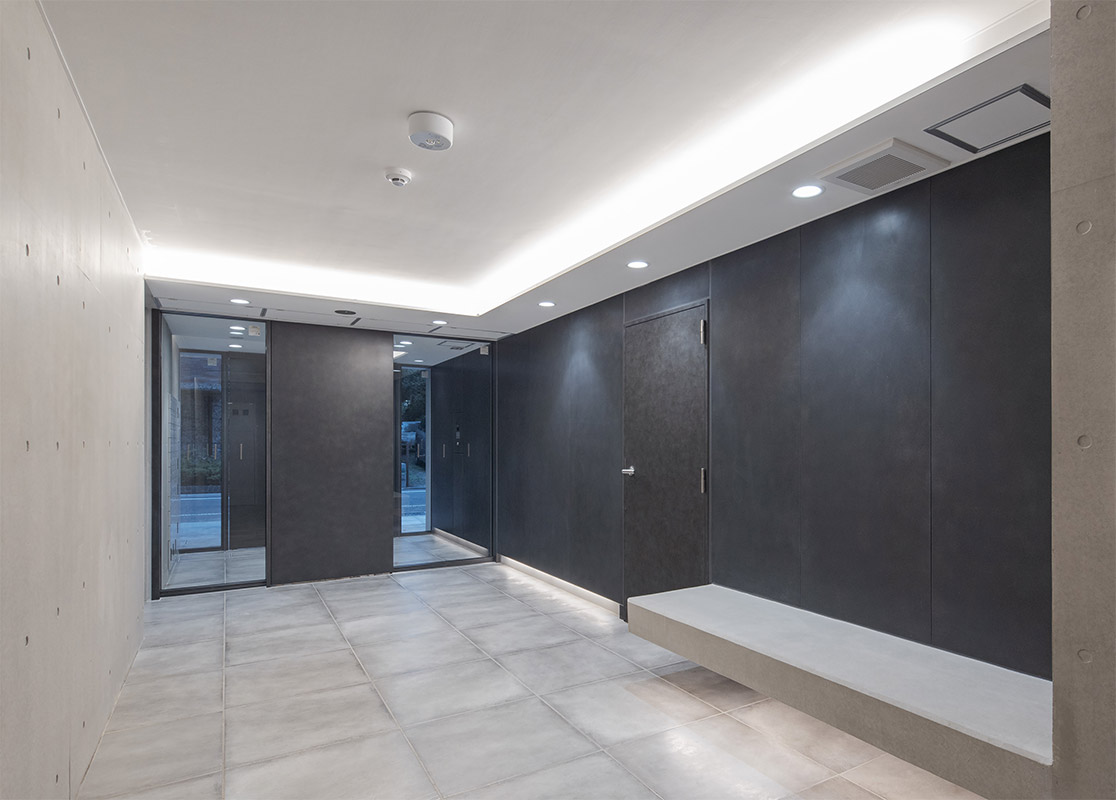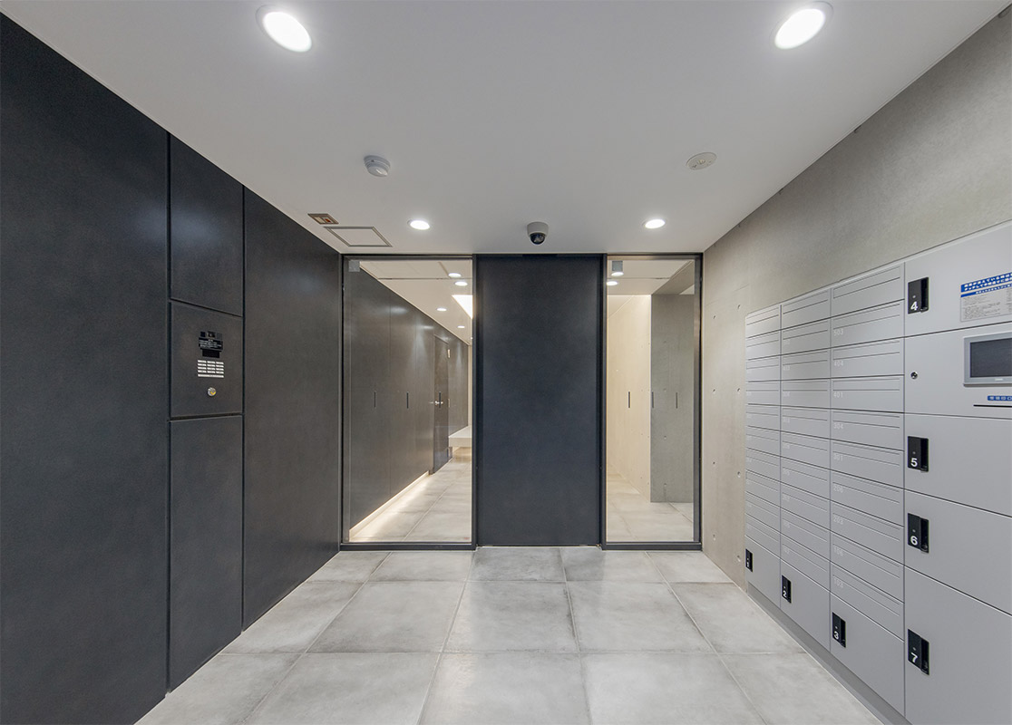 グランデュオ上野毛4は、コンクリートの建物に、金属板を積層させゆるやかに弧を描くように構成した手摺を取り付けることで、流れるような動きのある表情を創り出しています。その堅牢な佇まいは、見る角度や光の陰影によって変化するように設計しています。